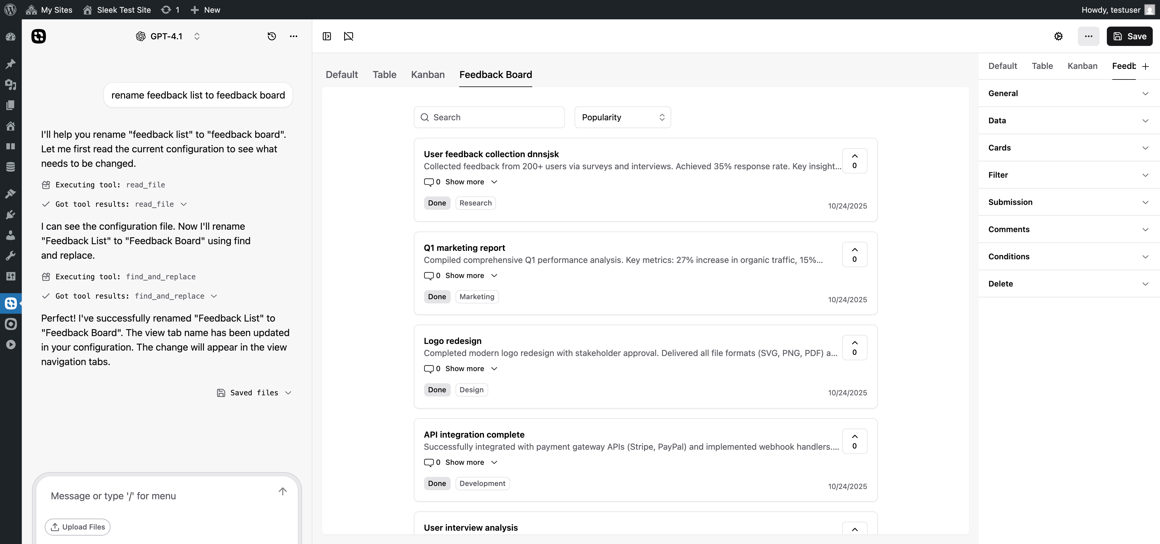 SleekView is a WordPress plugin that lets you create fully customizable views for any post type. Instead of being locked into one way of managing content, you can build multiple views, such as Kanban boards, feedback lists, or advanced tables, tailored to your workflow.